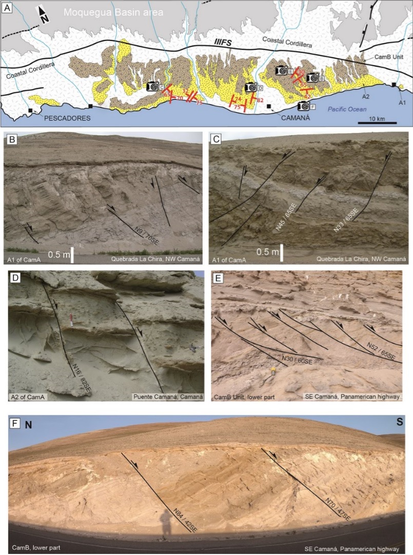 FIG. 8. Structural onshore data observed predominantly as normal faulting. A. Synthesized geological map of Camaná Formation in southwest coast of Arequipa Province; B, C and D. We observe normal faulting that affected sedimentary deposition of CamA unit, while E and F shows normal faulting that affected sedimentary deposition of CamB Unit of Camaná Formation.