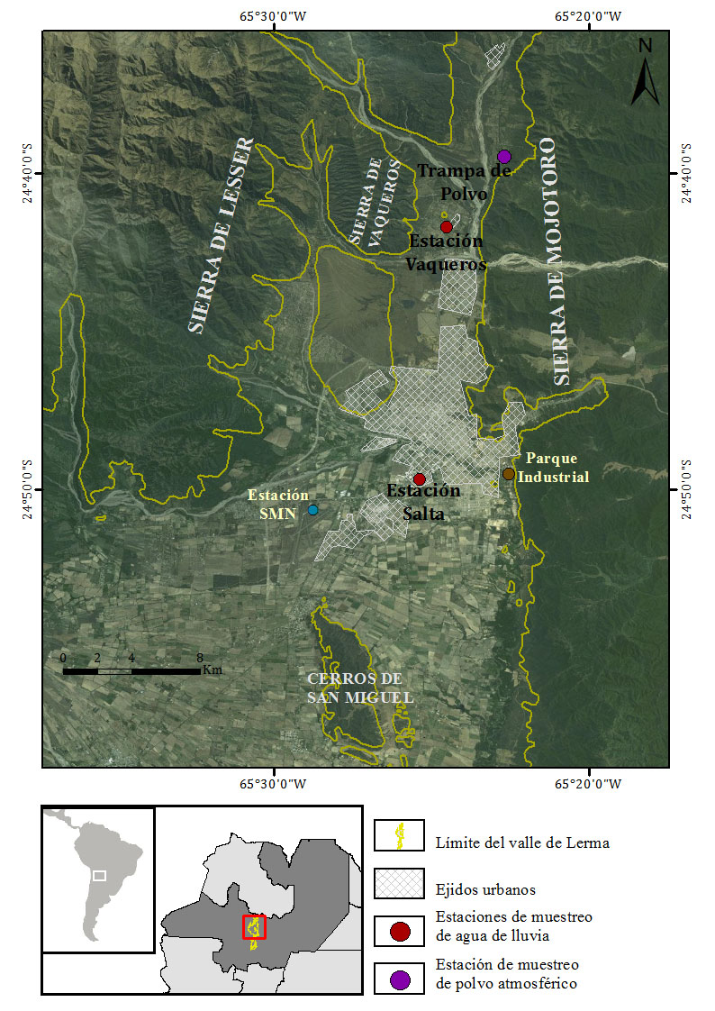 El noroeste argentino es una extensa región fuertemente influenciada por el ascenso y emplazamiento cenozoico de la cordillera de los Andes, afectada por pulsos magmáticos con abundante mineralización metalífera. El valle de Lerma,emplazado en la Provincia Geológica Cordillera Oriental, se ubica al este de la Provincia Geológica Puna (continuación austral del altiplano de Bolivia), donde se encuentran mineralizaciones polimetálicas (Ag, Au, Cu, Pb, Sn, Sb, Zn) que también están presentes en el sector boliviano. Dentro del valle de Lerma, el conglomerado urbano más desarrollado corresponde a la ciudad de Salta, con 700.000 habitantes, el que posee un discreto desarrollo industrial y un parque automotor pequeño constituido por 250.000 unidades (un vehículo cada 3 personas) (Musso, 2013; ADEFA,1995-2012). El valle de Lerma tiene características climáticas particulares asociadas a su carácter restringido por barreras orográficas, que influyen principalmente en las precipitaciones y los vientos superficiales (aquellos que se desarrollan en las capas bajas de la atmósfera). En las capas más altas de la atmósfera, la circulación atmosférica sobre el valle se caracteriza por vientos provenientes del sector oeste que al atravesar la región Puna-Altiplano levantan material particulado fino y eventualmente es depositado por vía húmeda o seca, en el valle de Lerma Gaiero et al., 2013).