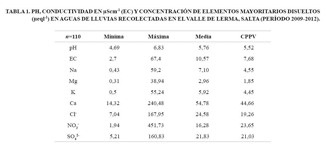 El pH de las lluvias de la región estudiada tiene un valor medio de 5,65±0,29, con un mínimo de 4,69 y máximo de 6,40. El valor de pH y las bajas concentraciones en los iones ácidos (SO42- y NO3-) se consideran coherentes con una zona que no presenta modificadores antrópicos significativos (industrias, intenso tránsito vehicular, etc.). El valor de pH aceptado como natural de lluvia no contaminada es el impartido por la solubilidad del dióxido de carbono (CO2) en equilibrio con la atmosférica que determina un valor de pH~5,6. Las disminuciones con respecto a este valor se deben a adición de componentes ácidos por actividades humanas (Charlson y Rodhe, 1982; Kaya y Tuncel, 1997). En otros casos, el polvo atmosférico rico en carbonatos de calcio puede aumentar el pH (Winkler, 1976; Sequeira, 1982).