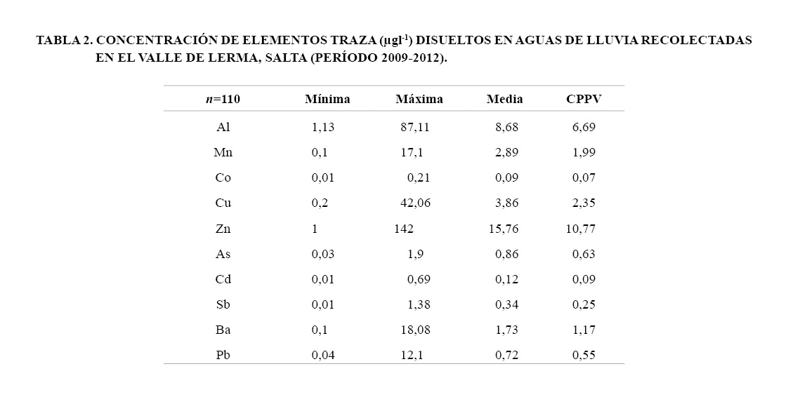Para el arsénico, Smedley y Kinniburgh (2002) y Bowell et al. (2014) definen como línea de base concentraciones que varía entre 0,013-0,032 μgL-1 para agua de lluvia de zonas continentales. Valores de As que indican contaminación antrópica se ubican por encima de los 0,5 μgL-1. Con este valor de referencia se podría afirmar que el As de las lluvias del norte del valle de Lerma se encuentra inusualmente enriquecido.