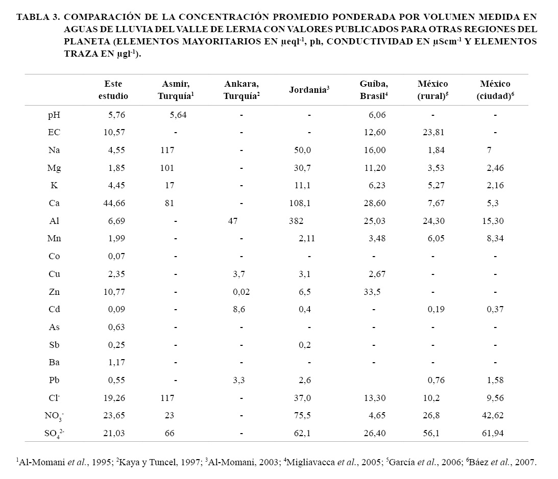 Las tablas 1 y 2 muestran las concentraciones promedio ponderadas por volumen, así como los valores mínimos, máximos y media aritmética para cada elemento de las 110 muestras recolectadas en los cuatro períodos de muestreo. La tabla 3 muestra una comparación de los datos de este trabajo con los publicados en otros lugares del mundo. A excepción del Ca, los elementos asociados a la corteza terrestre (Na, Mg, K, Al) son, en general, menores en el área del valle de Lerma. El valor de Ca obtenido en este estudio es superado solo por lo registrado en aguas de lluvia de Jordania, donde su origen se asocia a las frecuentes incursiones del polvo atmosférico proveniente del desierto de Sahara y a la extracción de carbonato de calcio para la fabricación de cal y cemento (Al-Momani, 2003).