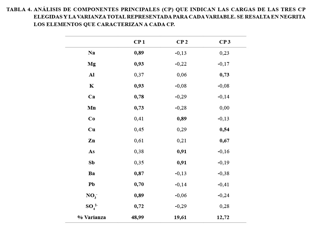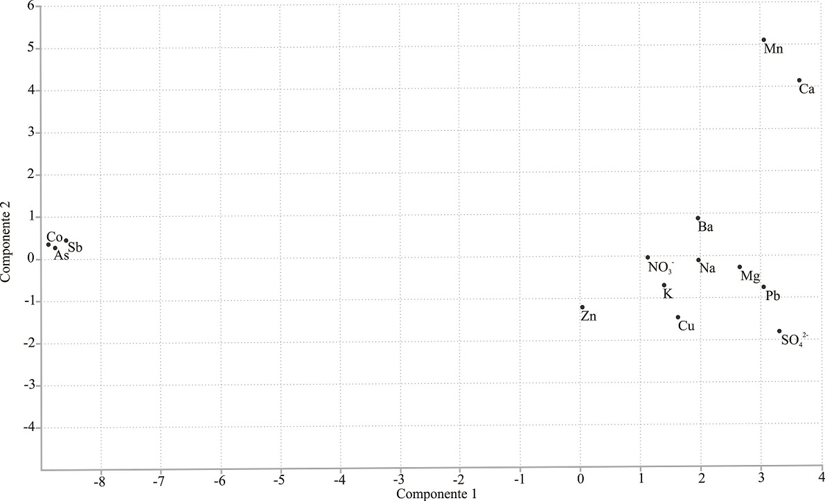 Las componentes CP2 y CP3 explican respectivamente el 20 y 13% de la varianza total. Estas componentes agrupan a los metales pesados que se encuentran en mayor concentración: Co-As- Sb (CP2) y Cu-Zn (CP3). Las fuentes asociadas a estos elementos son de incidencia local y podrían estar vinculadas a las frecuentes incursiones de sedimentos eólicos provenientes de la Puna. Rodríguez et al. (2001) explican la fuerte asociación entre As y Sb en depósitos auríferos de la sierra de Rinconada (Puna Jujeña). Asimismo, Goix et al. (2011) relacionan estos elementos con fuentes mineras o de la actividad de fundidoras de metales en el altiplano boliviano.