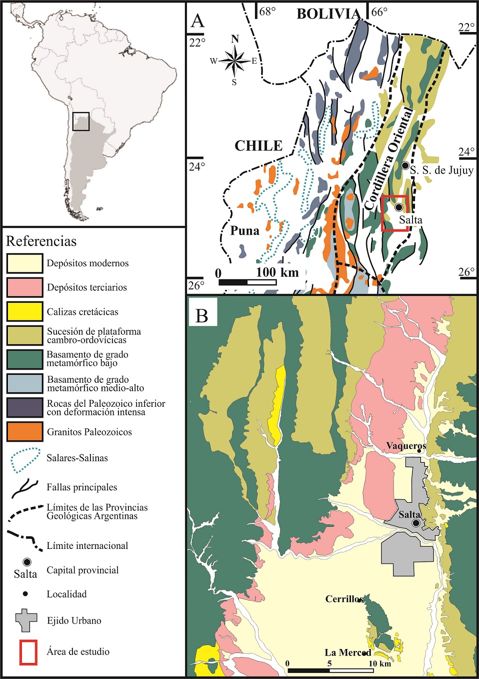 Fig. 2. A. Esquema geológico regional simplificado del noroeste argentino; B. Mapa geológico simplificado del tramo norte del valle de Lerma (modificado de Seggiaro et al., 2014)