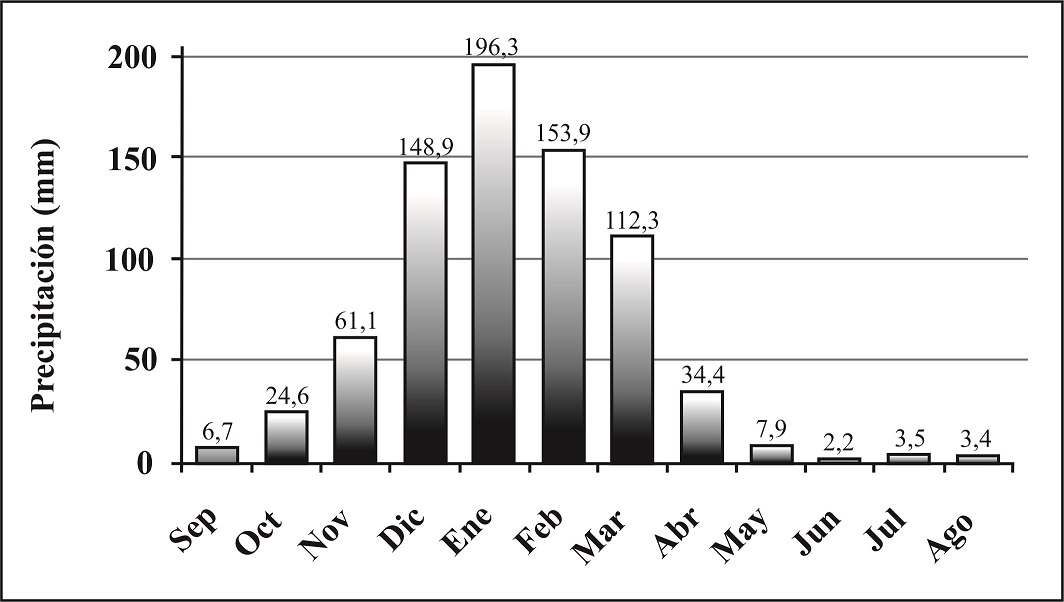 La figura 3 corresponde al diagrama de precipitación mensual que permite observar la estacionalidad de las precipitaciones locales, donde el 90% de las precipitaciones se concentran en los meses de noviembre a marzo, correspondiendo el 66% a los meses de diciembre, enero y febrero. La precipitación media anual se calculó en 755,2 mm para la serie 1980-2014.