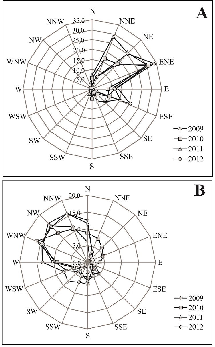 Fig. 4. Frecuencia de vientos en el norte del valle de Lerma obtenida con la información suministrada por el Servicio Meteorológico Nacional, estación Aero-Salta, período 2009-2012 A. Superficiales (~850 hPa) y B. de altura (500-200 hPa).