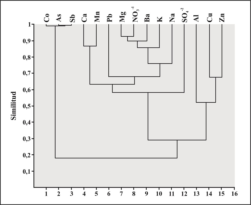 En la figura 5 se muestra el resultado del análisis cluster en modo R. A partir de un valor de 0,20 para el coeficiente de correlación, es posible diferenciar la asociación de tres grupos de elementos. El primer grupo está formado por los iones mayoritarios, minoritarios (Na, Mg, K, Ca, Mn, Ba, NO3-, SO42-) y Pb. El segundo está formado por los elementos traza Co, As, Sb. Este grupo muestra una alta similitud interna y una buena diferenciación con los otros grupos definidos (el coeficiente de similitud que lo diferencia del resto de los elementos es 0,20). Por otra parte, el tercer grupo asocia Cu, Zn y Al con una diferenciación de 0,30.