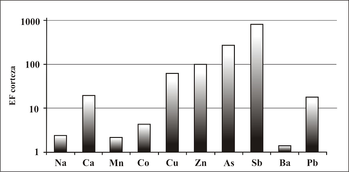 El análisis del factor de enriquecimiento (EFc) permite identificar los elementos que se encuentran más concentrados con respecto a la composición de una corteza promedio, para lo cual se utilizaron los valores promedio de corteza continental superior de Taylor y McLennan (1995). Los elementos para los cuales la corteza terrestre es la única fuente de aporte, tienen un EFc igual a la unidad. Para elementos que tienen otra fuente, además del material de la corteza, se espera que tengan un EFc mayor a 1 (Kaya y Tuncel, 1997; Báez et al., 2007). Sin embargo, valores menores a 10 no son necesariamente indicativos de una fuente no cortical, debido a que quizás no se registren las diferencias entre la composición química de la corteza local con la composición promedio utilizada como referencia (Kaya y Tuncel, 1997; Báez et al., 2007).