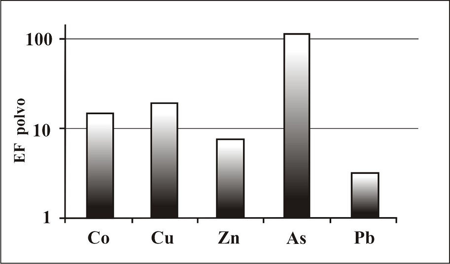 El cálculo del factor de enriquecimiento utilizando el polvo atmosférico proveniente de las tormentas originadas en la Puna como valor de referencia, ajusta este parámetro a la geología local, enriquecida en metales. Los valores del factor de enriquecimiento próximos a la unidad sugieren que el valor utilizado como referencia es la única fuente de aporte para los elementos encontrados en el agua de lluvia. En este caso, utilizando los valores del polvo atmosférico que ingresa desde la Puna como valor de referencia, los EFc iguales a 1 (hasta 10) indican que son los suelos de la Puna a través de las tormentas de polvo la única fuente de aporte de los elementos químicos encontrados en el agua de lluvia.