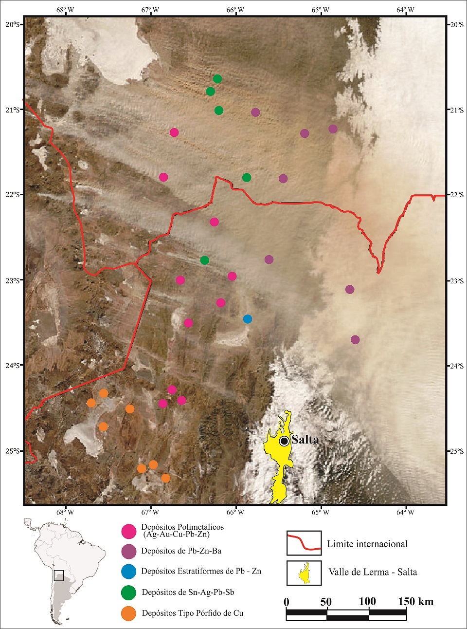 Por último se realizó un mapa con la imagen de una tormenta de polvo que se observó, a color verdadero, en julio de 2010 y que verifica el ingreso de vientos desde el NO en las capas altas de la atmósfera, sobre el cual se ubicaron los principales yacimientos minerales que caracterizan la región de la Puna (Argentina) y el Altiplano (Bolivia). Este mapa se realizó con un mosaico de tres imágenes satelitales MODIS-Aqua/Terra (http://lance-modis.eosdis.nasa.gov, última visita 15/03/16), donde se observa que la pluma de polvo se origina en los alrededores del salar de Uyuni (20º16’12’’S, 67º35’24’’O) y en el sector norte de la Puna (23º10’12’’S, 65º59’24’’O) y desde allí avanza en dirección NO-SE extendiéndose por cientos de kilómetros desde su lugar de origen. Durante su trayectoria atraviesa el norte del valle de Lerma, en donde fueron registradas evidencias de su paso en las trampas de polvo atmosférico colocadas para tal fin (Gaiero et al., 2013) y ubicadas cerca de los puntos de monitoreo de agua de lluvia, dentro del mismo valle. A su vez, cabe destacar, que al ser una zona con una intensa actividad minera se destacaron únicamente los yacimientos de mayor envergadura, tanto en explotación como aquellos que actualmente se encuentran abandonados.