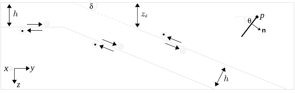 Fig. 2. Cross section of geometry of oblique subduction for a homogeneous elastic media, with dislocations surrounding the brittle oceanic plate. x and y are the directions parallel and normal to the margin, respectively; z is depth; h is the plate thickness; δ is the dip angle of subduction; zd is the depth to the downdip end of interplate coupling. At any point p, θ is the angle between the surface and the plane (normal to vector n) at which margin-parallel shear stress (τxn) is maximum.