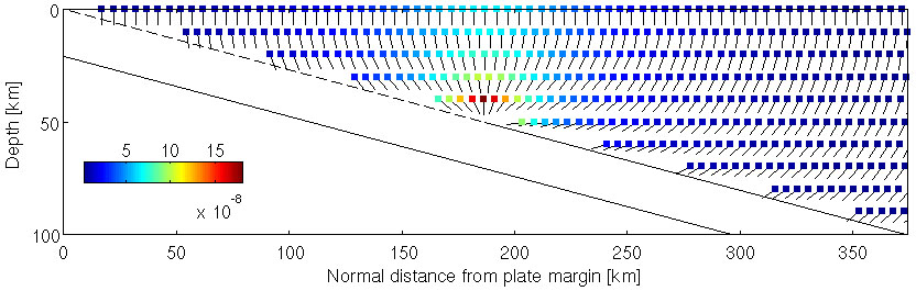 Fig. 3. Family of planes with maximum margin-parallel shear stress across the crust obtained for the south Chile subduction zone. Higher shear stress values are near the downdip depth. The effect of temperature on friction, favors a more inclined plane. The color bar displays the magnitude of shear strain.