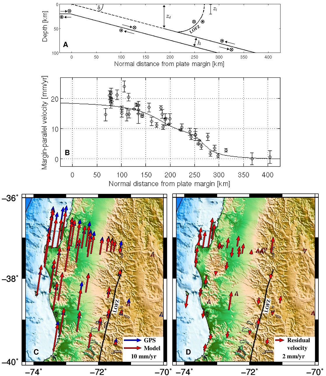 Fig. 5. A. Geometry of the best-fit model. This model considers both oblique motion of the subducting slab and strike-slip motion along the resulting LOFZ. zl is the locking depth for the LOFZ. Other notations are same as figure 2. The LOFZ accommodates half of the margin-parallel component of plate convergence. Observed versus modeled margin-parallel velocities between 37°-40° S, in B cross section, and C map view. D. Residual velocities obtained by subtracting the model from the GPS velocities.