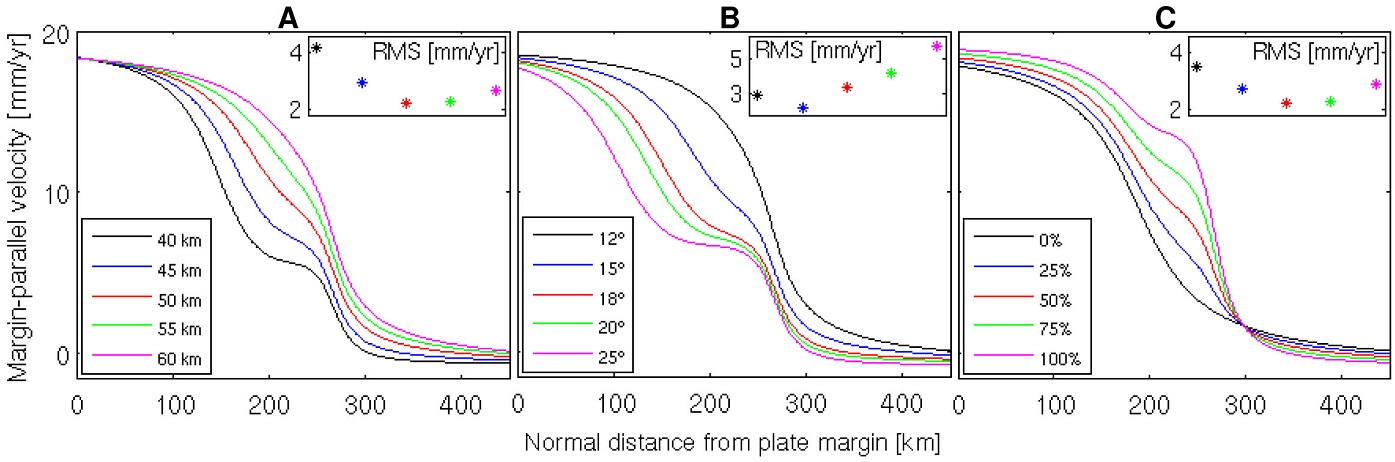 Fig. 6. Margin-parallel velocities and RMS, obtained for different values of: A. downdip depth limits; B. dip angles; and C. percentages of margin-parallel component of oblique convergence accommodated by the LOFZ.
