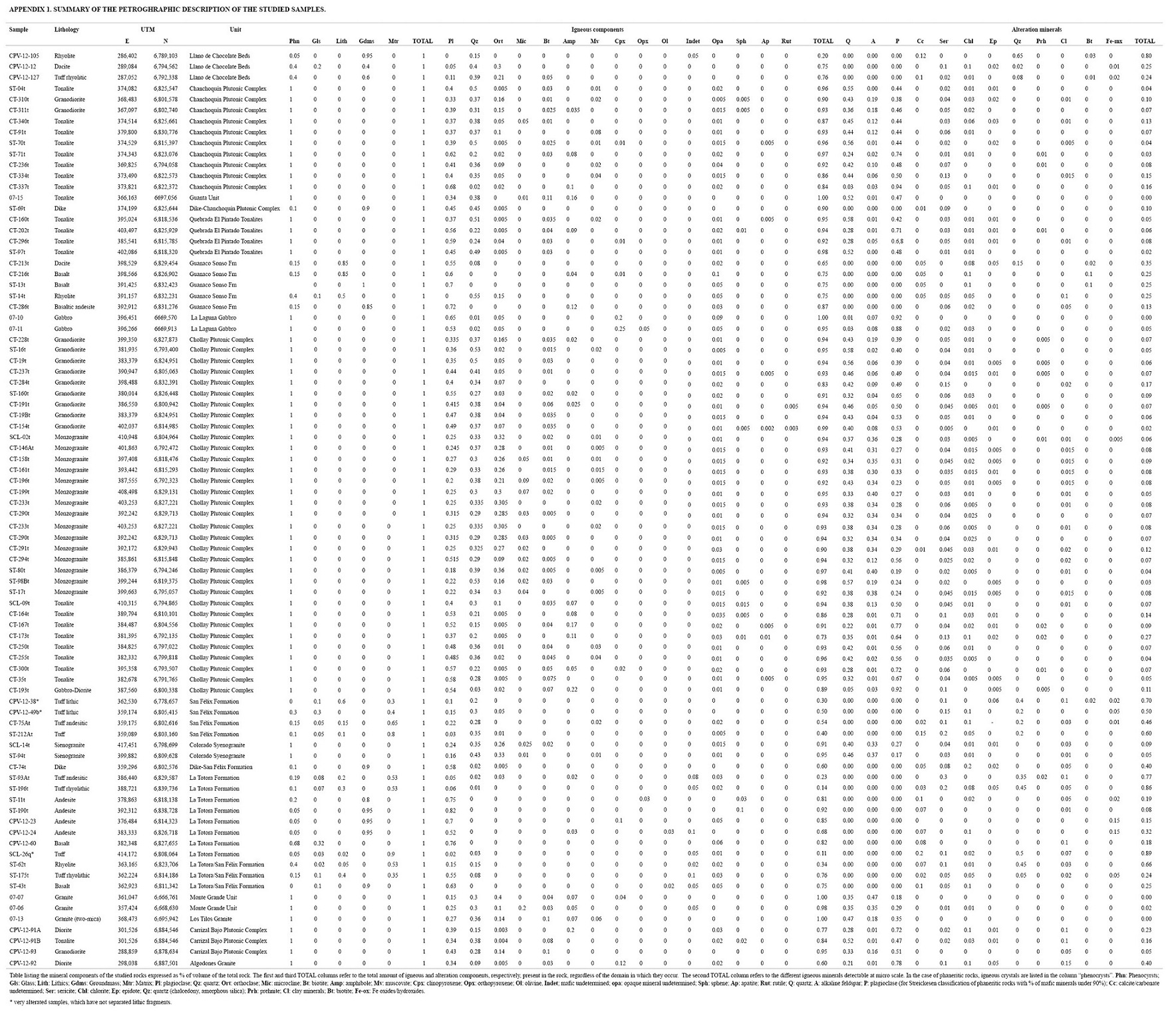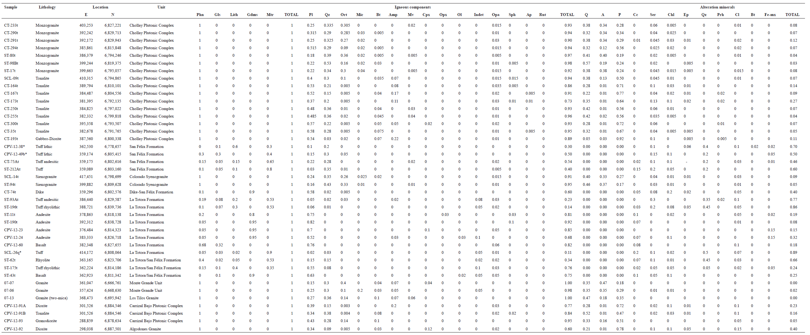 Secondary minerals are very common in the studied samples (see Table 1 and Appendix 1). The alteration minerals in the volcanic rocks can be up to the 25% of the total volume of the rock, whereas in the plutonic rocks is generally less than the 10%, with some exceptions up to 40% (Algodones granites). The exception are: sample CPV-12-105 (Llano de Chocolate beds), a silicified rhyolite or rhyolitic tuff for which the recognized volume of secondary quartz reaches the 85%; sample CPV-12-38 (San Félix Formation), a lithic tuff with a total volume of alteration minerals, mainly secondary quartz, of 39%; four samples of Coastal Cordillera intrusives (CPV-12-91A, CPV-12-92, CPV-12-93 and CPV-12-03) with total volume of alteration minerals ranging from 26 to 12%, being chlorite the main secondary phase; and four samples of the Chollay Plutonic Complex (CT-164q, CT-173q, CT-184q, CT-191q) with total volume of alteration minerals ranging from 26 to 12%, being sericite the main secondary phase. In addition, three samples of pyroclastic rocks (sample CPV-12-38 and CPV-12-49b, San Félix Formation; SCL-26q, La Totora Formation) are strongly altered and lithic fragments were not separate, which implies that these samples have not been considered in the interpretation of the tectonic implications. Calcite and sericite are ubiquitous alteration mineral phases in the volcanic rocks, whereas clay minerals, chlorite and sericite are the dominant secondary minerals in the plutonic rocks. Sericite and clay minerals replace plagioclase phenocrysts and calcite occurs in fractures, amygdules or as replacement of phenocrysts. The high loss on ignition in some of the volcanic and plutonic rocks is consistent with the widespread occurrence of calcite (Table 2).