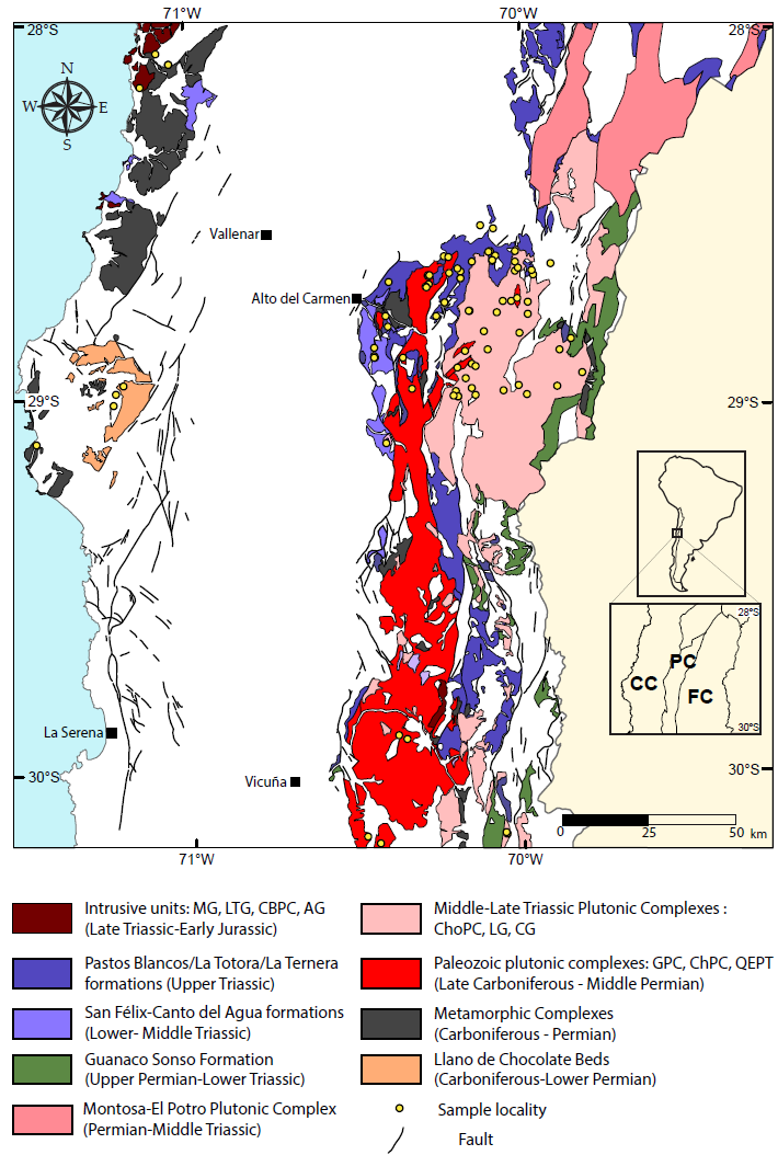 The geological cartography of northern Chile between 27°00’ and 30°00’ has been updated over the past decade with works performed, at 1:100.000 scale, by the Servicio Nacional de Geología y Minería (SERNAGEOMIN) (Welkner et al., 2006, Arévalo and Welkner, 2008; Moscoso et al., 2010; Salazar et al., 2013; Creixell et al., 2012; Creixell et al., 2013; Martínez et al., 2015; Ortiz and Merino, 2015; Salazar and Coloma, 2016). These works include large geochronological databases in addition to refined litho stratigraphic unit definitions. In particular, the Late Paleozoic to Triassic rock units has been significantly modified, incorporating several new units and redefining those previously known. Even though extensive outcrops of acidic volcanic and subvolcanic rocks from the Late Carboniferous to the Permian are exposed in the Precordillera and Frontal Cordilleras, and interpreted as equivalents to the Choiyoi Group. The Triassic rock units are more diverse and include large plutonic complexes, explosive volcanic sequences of dacitic to rhyolitic composition, continental to marine sedimentary sequences with minor volcanic component, and volcanic sequences of basaltic-andesite to rhyolitic composition (Reutter, 1974; Nasi et al., 1990; Salazar et al., 2013; Ortiz and Merino, 2015; Salazar and Coloma, 2016). Thus, the development of a continental rift phase in the South American plate during the Triassic is not a straightforward from the geological record in northern Chile between 27º and 30º S. Furthermore, extensive geochemical data from the Triassic units is lacking, precluding a tectonic interpretation of the magmatism from its chemical signature.