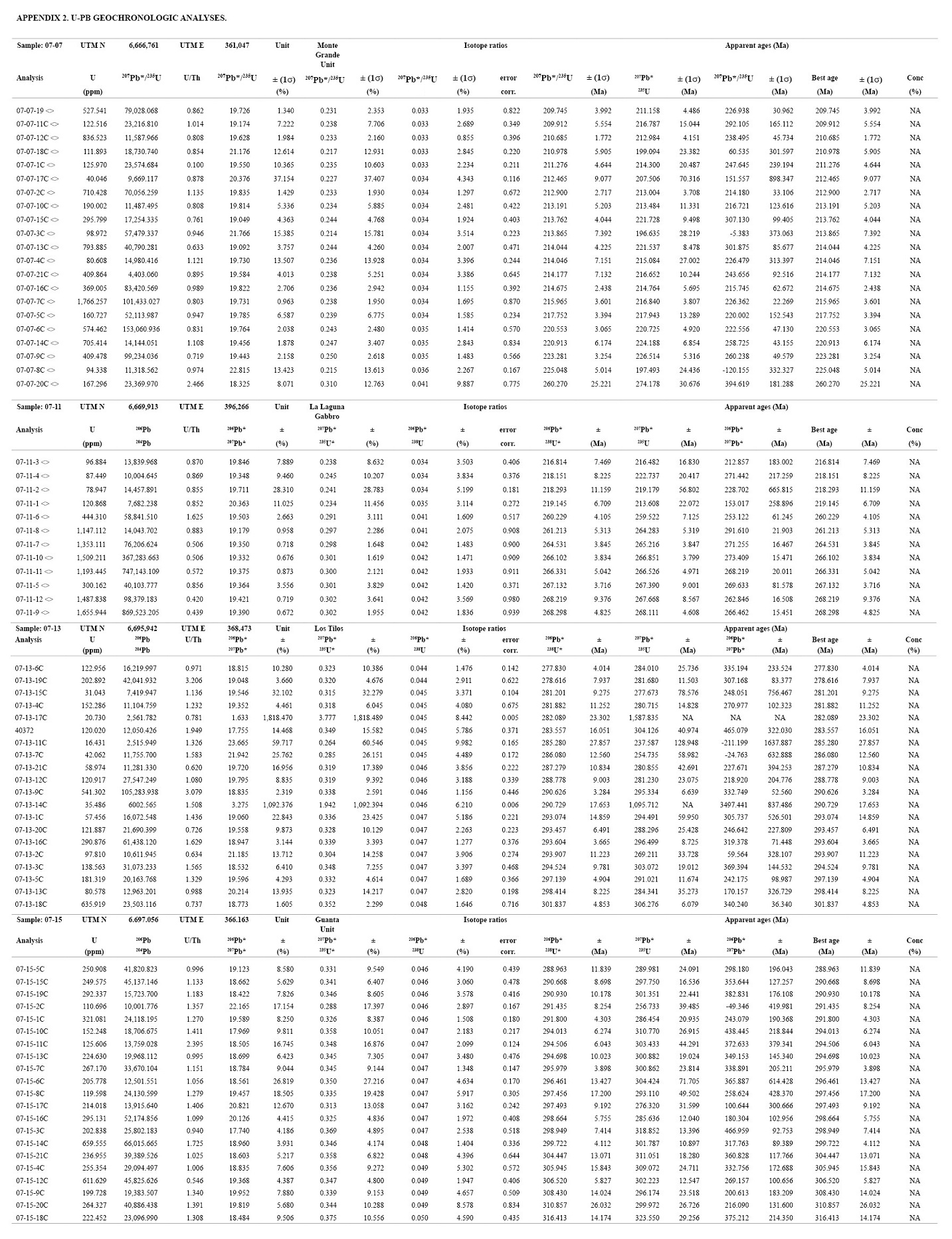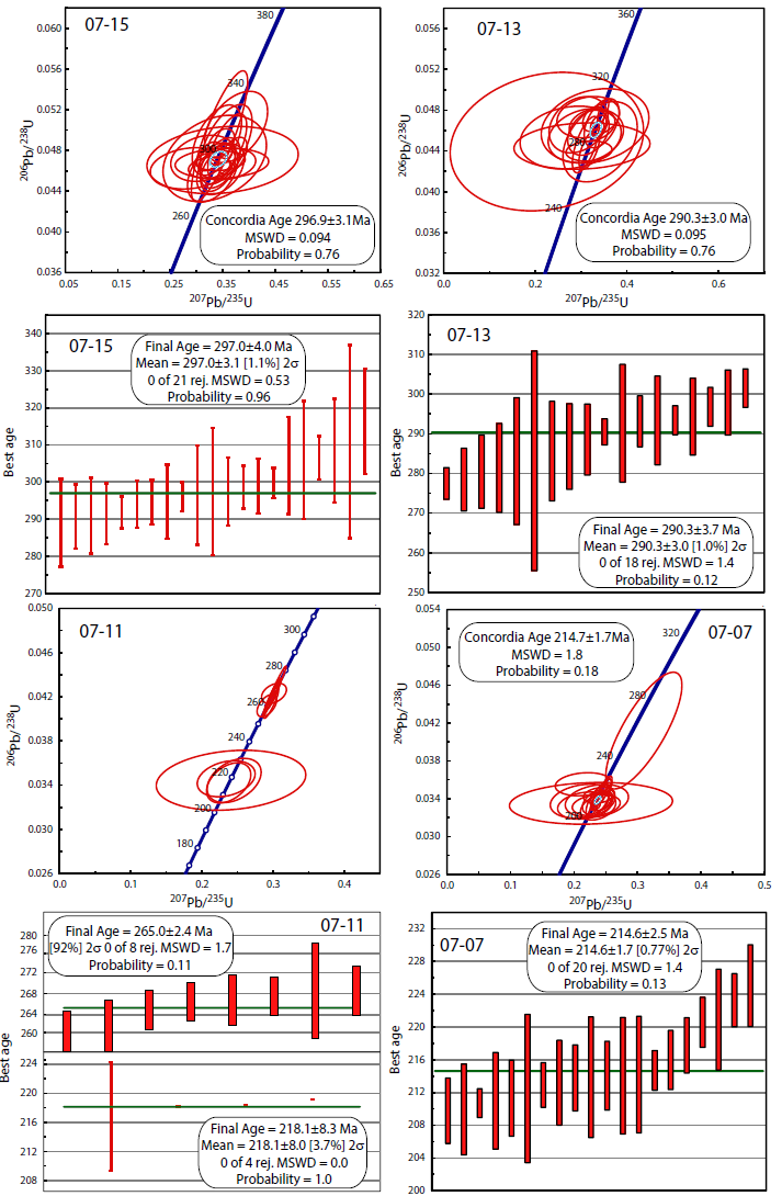 One sample from the Guanta unit (O7-15), equivalent to the Chanchoquín Plutonic Complex, displays an age distribution pattern with a single-peak, for which the best estimated age is 297.0±4.0 Ma. One sample from a body assignated to Los Tilos pluton (O7-13) also yielded a single-peak age distribution pattern with a best estimated age of 290.3±3.0 Ma. In both cases, there are no discordant ages from individual grains. The age of the Guanta unit agrees with previous reported data (Nasi et al., 1985; Hervé et al., 2014; Maksaev et al., 2014). In contrast, the Los Tilos pluton has been before assigned to the Ingaguás Superunit (Nasi et al., 1985) and dated at 215.6±1.9 Ma (Hervé et al., 2014) discordant with the result obtained in this work (290.3±3.0 Ma). Given that there are no younger single-grain ages, either concordant or discordant, in the analyzed sample, it is difficult to discard the result obtained for sample O7-13, but it is possible that it does not belong to the Los Tilos Pluton since the other data point to a Late Triassic rather than Early Permian age.