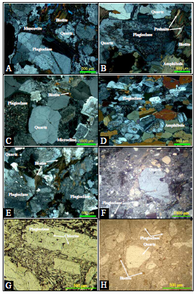 The Chanchoquín Plutonic Complex is composed mainly of tonalites and granodiorites with minor monzogranites and diorites, the studied samples include only tonalitic and granodioritic lithologies. Granodiorites are fine to medium grained and contain quartz with undulatory extinction, plagioclase, orthoclase, biotite and minor muscovite or amphibole; accessory minerals are Fe-Ti oxides (mainly magnetite) and sphene. Perthitic texture is observed in some feldspar crystals. These lithologies are slightly altered (less than 10% volume of the rock) with sericite replacing feldspars and prehnite and epidote replacing biotite. Tonalites are medium to fine grained, they contain quartz with undulatory extinction and polycrystalline, zoned plagioclase, orthoclase, biotite, muscovite, minor amphibole, with Fe-Ti oxides and apatite as accessory minerals. Alteration minerals are generally less than the 8% of the rock, but in three samples they reach the 15%, with sericite replacing feldspars and chlorite, epidote and prehnite replacing mafic minerals. At the outcrop scale, the rocks are foliated to variable degrees.