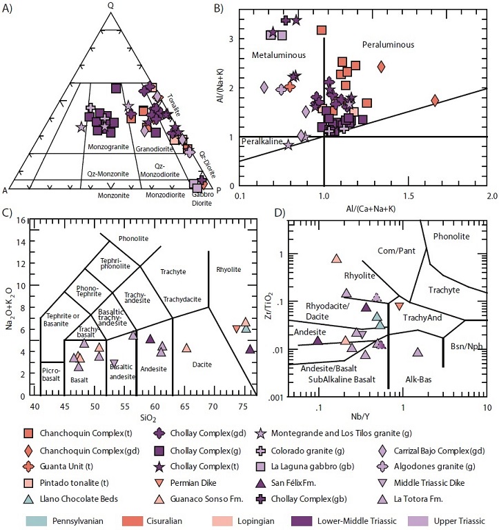 The Triassic magmatism at the present-day Coastal and Frontal Cordilleras between 28°00’ and 29°30’ S is mainly represented by plutonic units comprising tonalitic to monzogranite rocks, with scarce syenogranites and more basic rocks such as gabbro and diorite, of which the Chollay Plutonic Complex is the volumetrically most important. Volcanic sequences are more restricted but not uncommon, and they are composed of rocks ranging from basalt to rhyolite, being more abundant the differentiated rocks.