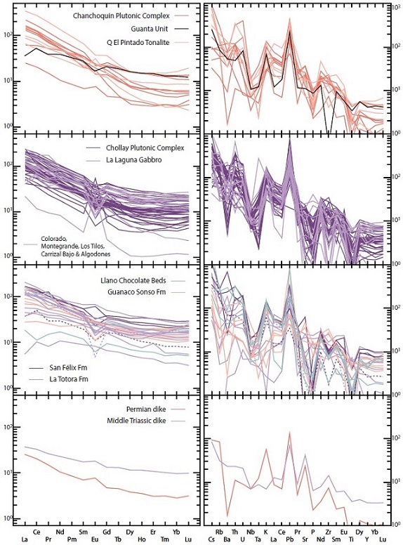 Abstract: Permian to Triassic igneous rocks cropping out in the Coastal and Frontal cordilleras in northern Chile between 28º00’S and 30º15’S have long been interpreted to represent products of magmatism related to an extensional tectonic setting, either as the result of crustal anatexis or asthenospheric mantle decompression melting, in a passive continental margin. Eighty-six samples of plutonic (61) and volcanic (25) rocks from this region are characterized petrographically and geochemically. They are Permian to Early Jurassic in age, but the majority of the studied rocks correspond to the Lower to Middle Triassic Chollay Plutonic Complex, the volumetrically most important unit in the area. The rock samples have features typical of magmas derived from flux-induced melting of a depleted mantle such as: broad range of petrographic composition with predominance of intermediate to acid members, highly porphyrytic volcanic rocks, magnetite as the Fe-Ti oxide mineral phase, enrichment in LILE over HFSE, marked depletion in Nb, Ta, Ti, and P and moderate to no negative Eu anomalies. Few of the studied rock samples (<10%) have alkaline signature and trace element contents representative of anorogenic magmatism. In this work, we propose that subduction of an oceanic plate beneath the South American continent is responsible for the evolution of the margin from the Permian to Early Jurassic, at the studied latitudes. A preliminary interpretation of the margin architecture of the Andean margin from the Permian to the Triassic would be that the Chanchoquin and Chollay plutonic complexes represent the roots of a magmatic arc developed from the Permian to the Middle or early Late Triassic, whereas the Guanaco Sonso and Pastos Blancos formations would be the shallower parts of such arc. The La Totora Formation and some volumetrically minor Upper Triassic intrusive units represent magmatic products with alkaline signatures, which developed immediately before the establishment of the magmatic arc in the present-day Coastal Cordillera (during the Rhaetian to Early Jurassic).
