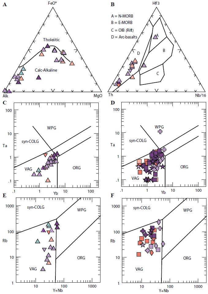 The studied rocks are very heterogeneous both petrographically and from their major element composition. The trace elements content is also variable, but they display similar geochemical patterns (e.g., REE) suggesting uniform chemical behavior (Fig. 5). In particular, the marked enrichment in LILE over HFSE is present in all the spider diagrams of figure 5, both for plutonic and volcanic rocks. The volcanic rocks are all subalkaline and plot within the calk-alkaline field of the AFM diagram (Fig. 7a). All but one of the basic and intermediate samples (CPV-12-24 of the La Totora Formation) have also HFSE contents representative of calc-alkaline affinities (Fig. 7b) and the more acidic rocks plot in the field of arc granites based on their LILE and HFSE contents (Fig. 7c, e). Although the number of analyzed volcanic rocks does not allow a robust statistical analysis, it is noteworthy to point out that they comprise the entire petrographic range for subalkaline volcanics, from basalt to rhyolites and there is no bimodal distribution in their composition (Fig. 4c, d). The plutonic rocks also lack bimodal distribution of their compositional ranges, and tonalite is the most abundant lithological type, followed by monzogranite and grandiorite (Fig. 4a). Very few basic intrusions, such as gabbro or diorite, are found among the studied intrusive units (Fig. 4a). In the tectonic discrimination diagrams of Pearce et al. (1984), nearly all samples plot in the “Volcanic Arc Granite” field (Fig. 7d, f). Only two samples of the Colorado Syenogranite unit are outside this pattern, plotting in the field of “within plate magmatism” (Fig. 7d).