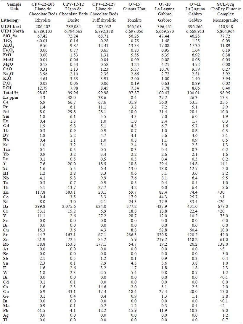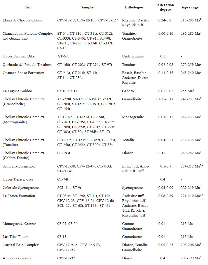 Major and trace elements abundances for the studied volcanic and plutonic rocks are listed in Table 2 and in Salazar et al. (2013). Prior to the description of the geochemical results, the issue of the secondary alteration processes that affected the studied rocks is addressed.