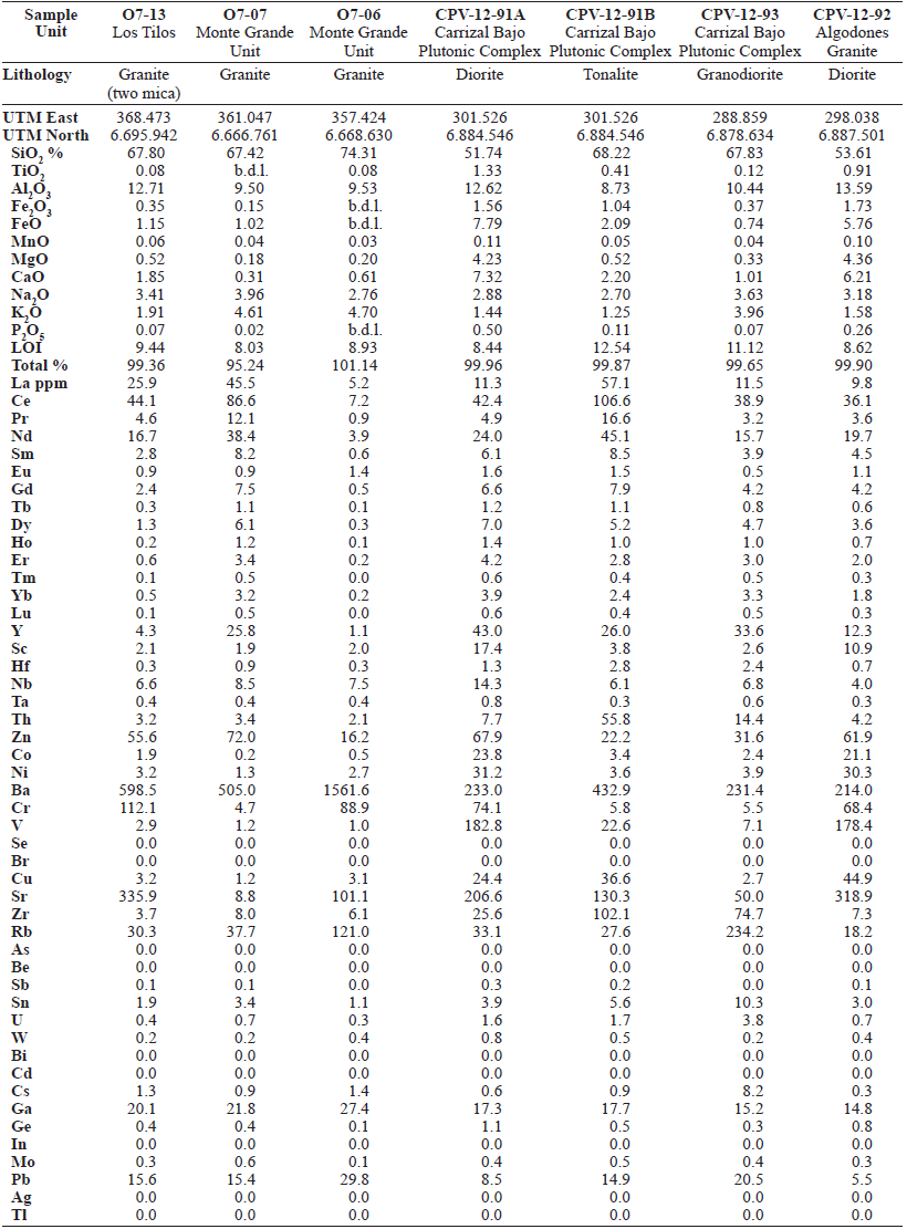 As observed in the multi-element diagrams (Fig. 5) most of the studied samples show enrichment in LILE compared to HFSE, relative to primitive mantle concentrations. High contents of Pb as well as a depletion in Nb-Ta, Ti and P are observed in rocks of all units. The volcanic rocks show a much larger dispersion in LILE than any of the plutonic lithologies, especially Cs and Rb. Such pattern is likely due to hydrothermal alteration or very low grade metamorphism. The rocks of the La Totora Formation have the lowest LILE contents but still enriched in this groups of elements compared to HFSE.