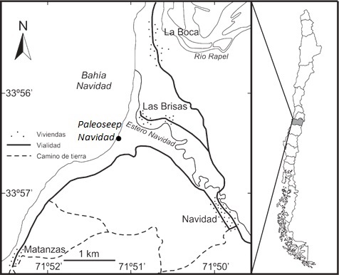 En la playa de la localidad de Navidad, se encuentra un afloramiento de carbonato de calcio con fósiles, que reúne las características determinativas de un paleoseep, el primero en ser reportado en un área emergida del margen continental chileno. Nuevos hallazgos en cuencas marinas exhumadas resultan altamente esperables, considerando las condiciones geológicas y tectónicas asociadas a la subducción activa desde el Mesozoico temprano (e.g., Mpodozis y Ramos, 1989). Por lo anterior, resulta fundamental documentar y contribuir en el conocimiento de estos particulares ecosistemas y sus implicancias. El objetivo de este artículo es caracterizar y aportar los antecedentes mineralógicos, paleontológicos y geoquímicos que han permitido confirmar la presencia en este lugar, del primer paleoseep reconocido en la costa de Chile central (Mena et al., 2011; Contardo y Mena, 2012), estratigráficamente asociado a las rocas de la Formación Navidad.