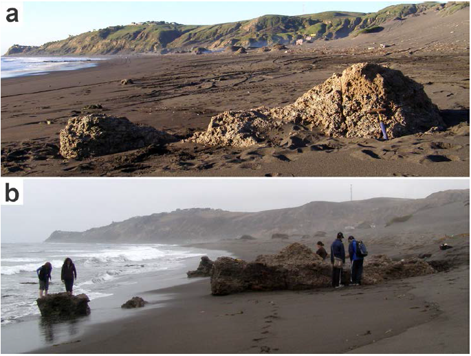 El PSN constituye una estructura de carbonato de calcio, preservada en la playa de la localidad de Navidad. La exposición de este montículo de carbonato, varía según los volúmenes de arena que lo cubren, debido a las marcadas fluctuaciones estacionales. Durante las visitas, efectuadas en los meses de mayo y agosto, se ha observado alrededor de 30 a 40% del afloramiento. En contraste, en el período estival (diciembre), se aprecia una mayor superficie expuesta (Figs. 2a y b). Se identificó, además, una segunda acumulación carbonática de la misma naturaleza, orientada en dirección paralela al afloramiento principal, a una distancia de 19 m al norte de la primera. Este trabajo se enfoca en la descripción del afloramiento principal, en el cual se realizaron las primeras observaciones, muestreo y determinaciones isotópicas.