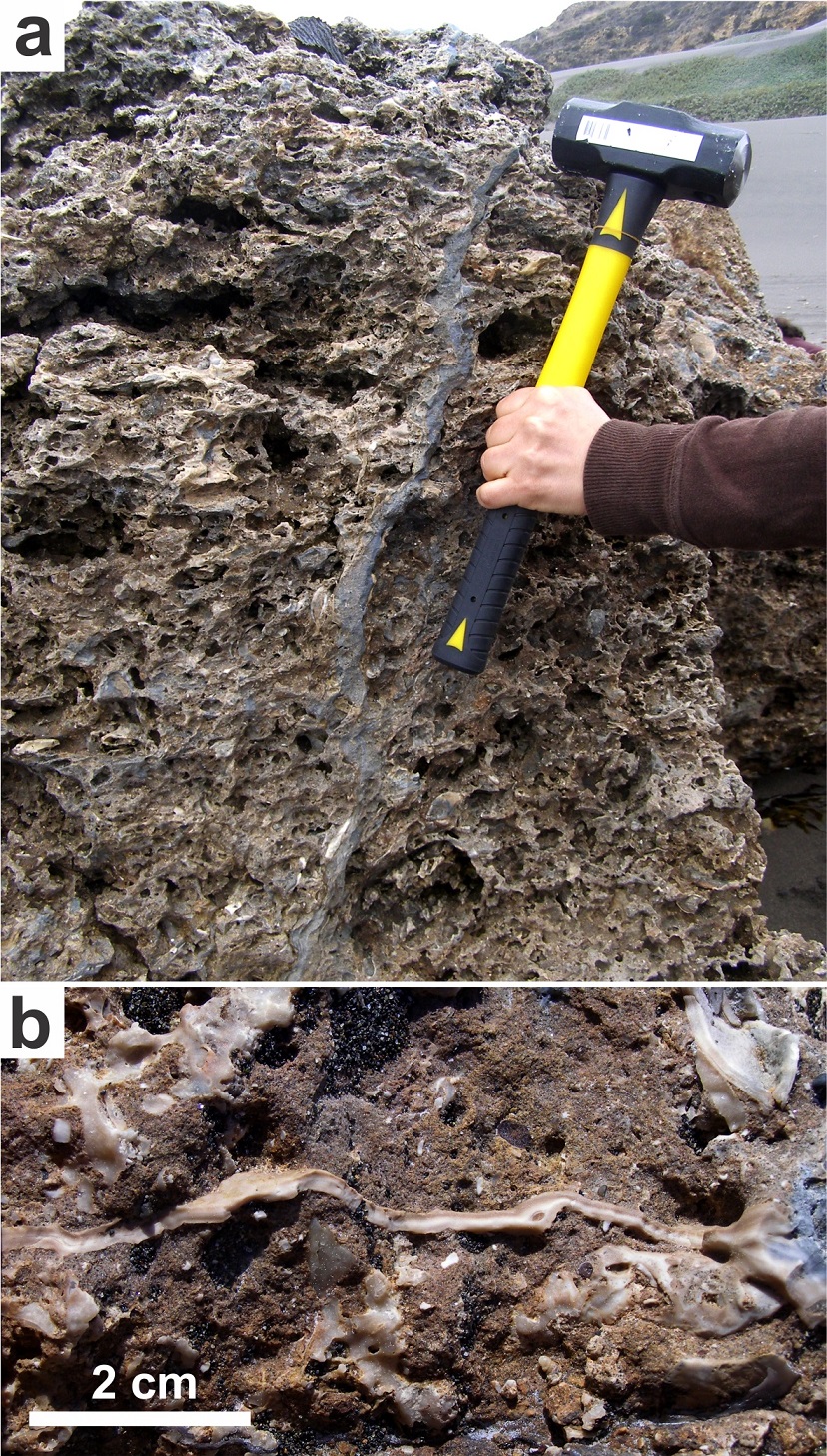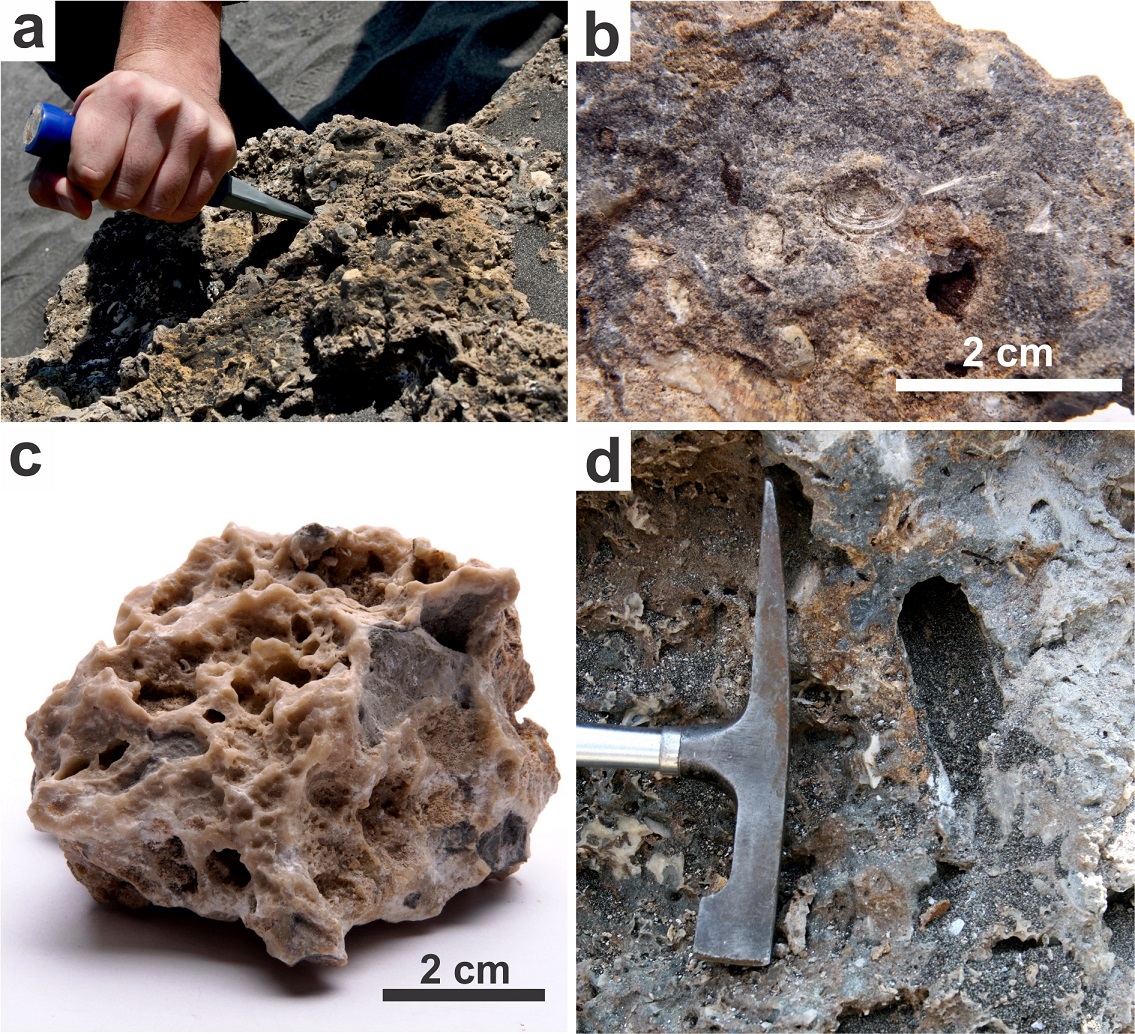 El PSN constituye un montículo alargado, dispuesto en dirección N45° W, perpendicular a la línea de costa. Las dimensiones máximas -observadas durante el período estival- normalmente abarcan los 3 m de ancho, 7 m de largo y 1,60 m de alto. Este particular afloramiento de carbonato de calcio, se presenta con aspecto macizo y en costras irregulares, muy bien compactado (Figs. 3a, b, c). En él se identificaron conductos tubulares, de hasta 3 cm de diámetro, en algunos casos con precipitado carbonático en su interior (Fig. 3d). Vetillas de calcita de color blanco lechoso de 0,4 cm de espesor y gris oscuro de ~1,5 cm en dirección casi perpendicular al eje mayor del afloramiento (Fig. 4).