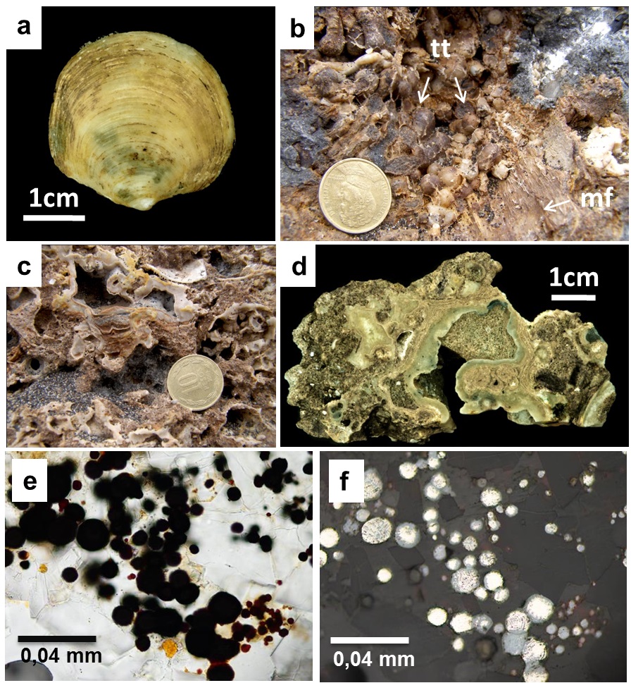 Entre sus componentes fósiles destacan bivalvos, gasterópodos, teredos y estromatolitos asociados a comunidades de gusanos calcáreos (Fig. 5). Como bivalvo predominante se destaca la especie de Lucinoma promaucana (Nielsen, comunicación verbal, 2011). Esta se encuentra distribuida en todo el afloramiento. Los teredos se encuentran en fragmentos leñosos carbonatizados, con aspecto fibroso característico de la madera, bien preservado. En la figura 5b se muestra la icnofacies Teredolites, resultado de la perforación de la madera por moluscos xilófagos del género Teredo (Kelly y Bromley, 1984; Ferrer y Gilbert, 2005), cavidades que se encuentran rellenas con material carbonatado.