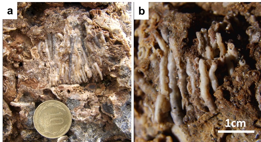 a. Se observan abundantes tubos de poliqueto fósiles, muy bien preservados. La fotografía muestra su disposición vertical, tal como se disponen en el afloramiento; b. Detalle que muestra el excelente grado de preservación los tubos de gusanos fósiles.