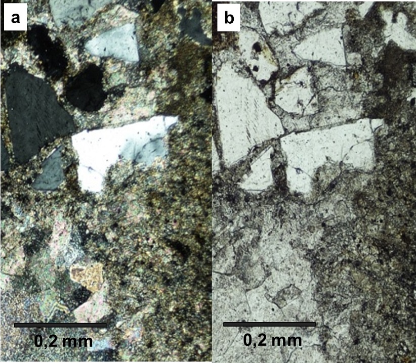 Los componentes minerales y las microtexturas del carbonato fueron identificados a través de secciones transparentes, donde se determina una matriz soportada carbonatada (75-85%), principalmente micrítica y entre un 15-25% de granos minerales y líticos. En función de sus características texturales, las litologías principales se clasifican como mudstone y wackestone (Dunham, 1962). Adicionalmente, las costras de carbonato blanco lechoso corresponden principalmente a esparita, normalmente asociada a pirita framboidal (Figs. 5e y f). La composición de los granos consiste, en su mayoría, en minerales individuales de cuarzo anguloso (Figs. 7a y b) y plagioclasa subhedral (principalmente albita), seguido de fragmentos líticos y en menor proporción de anfíboles, ortoclasa y microclina. Los líticos son predominantemente volcánicos, los bioclastos son minoritarios (e.g., restos de conchas, foraminíferos).