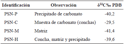 Los valores de δ13C determinados en la matriz y en conchas de bivalvos varían entre -41,4‰ en y -29,5‰ PDB (Tabla 1).
