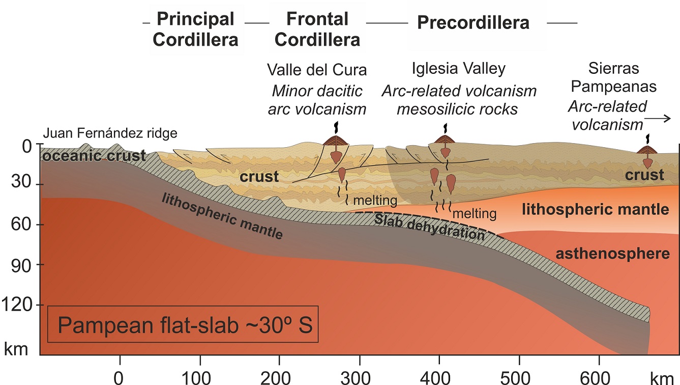 During Miocene times, the basin was passively transported above a horizontal décollement surface that links mid-crustal deformation, beneath the Cordillera Frontal, with surface thrusting in the western Precordillera (Jordan et al., 1993a). Deformation and structural style are compatible with the simultaneous uplift of the Cordillera Frontal and the Precordillera. Besides, prior to the Cordillera del Colangüil rise, the Iglesia Valley Basin was connected with the Valle del Cura area and it was only since the Late Miocene (Alonso et al., 2011) that the Colangüil rising began to separate both depocenters. Previously, during Early to Middle Miocene, Andean compression formed the La Tranca thrust separating the eastern Iglesia Valley Basin from the western Bermejo foreland Basin (Jordan et al., 1993a, b). The rise of La Tranca thrust in Precordillera was temporally correlated with extensive eruptions of the calc-alkaline andesitic lava flows in the Valle del Cura region. Indeed, the regional structure is a result of the increase of the compressional regimen by Middle Miocene due to the slab shallowing that has been attributed to the collision of the Juan Fernández Ridge with the South American plate (Pilger, 1981, 1984; Yáñez et al., 2001; Kay and Mpodozis, 2002). Thus, the increase in compressional setting due to shallow subduction influenced the genesis and evolution of Middle to Late Miocene (13-6 Ma) volcanic rocks in the main arc as reflected in their geochemical signature (Ramos et al., 1987, 1989; Kay and Abruzzi, 1996; Kay and Mpodozis, 2002; Kay et al., 1991, 1999; Litvak et al., 2007; Jones et al., 2016).
