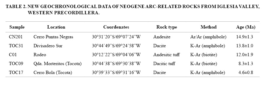 We present new 40Ar/39Ar and K/Ar ages carried out at the Geochronology Laboratory at SERNAGEOMIN, Chile. The results are summarized in table 2 and plotted in figure 2. An amphibole 40Ar/39Ar age of 14.9±1.3 Ma was obtained from an andesite at Cerro Puntas Negras (sample 201), while an amphibole K-Ar age of 13.8±1.0 was achieved in a dacite from Divisadero Sur (sample TOC 31). A biotite K-Ar age of 12.0±1.9 Ma corresponds to the base of the pyroclastic flow (sample C01) at the Iglesia Valley, near Rodeo, and another biotite K-Ar age of 8.3±1.3 Ma comprise the upper part of the Ignimbrite flow at Iglesia Valley in Quebrada Morterito (sample TOC 09; Fig. 4B). Also, another amphibole K-Ar age of 4.6±0.8 Ma was obtained from cerro Bola dacite (sample TOC 17; Fig. 4B).