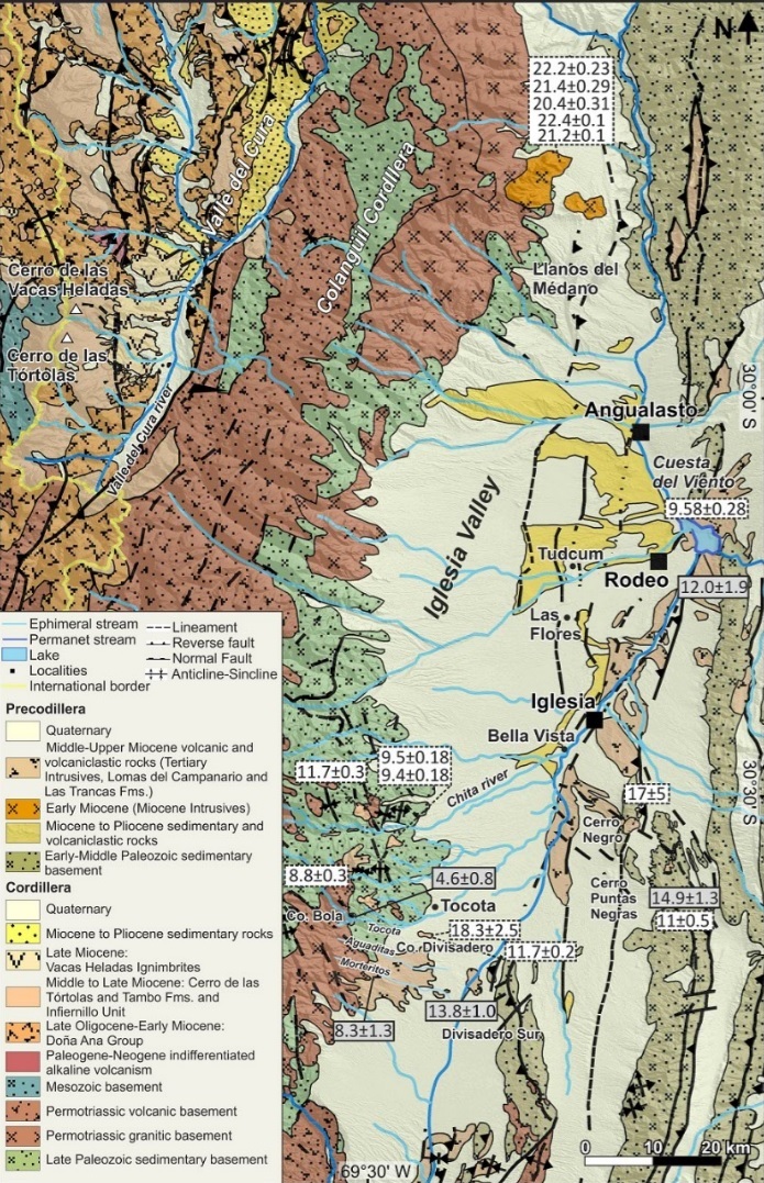 Based on this new and the previously published geochronological information, added to the field observations, we can establish that volcano-sedimentary activity was almost continuous between Middle to Upper Miocene in the Iglesia Valley depocenter, with a magmatic activity decreasing in intensity and frequency as the age decreases, to cease around Lower Pliocene (~4 Ma), the youngest age of magmatic activity registered in the area. First expression of this volcanic activity could be related to the shallow intrusives of Early Miocene age (22-20 Ma) outcropping in the northern part of the Iglesia Valley area (Fig. 2).