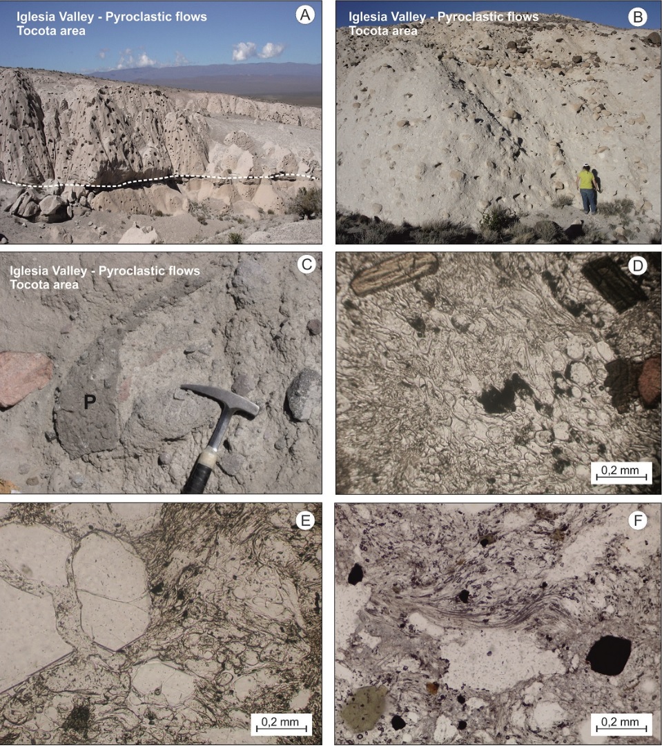 FIG. 3. Pyroclastic rocks of the Lomas del Campario Formation. A. Pyroclastic flow in Tocota area at Iglesia Valley showing two flow units; B. Detailed on the top of one pyroclastic flow, with reversely graded coarse pumice fragments; C. Deformation of a pumice fragment (P) transported under plastic conditions at high temperature; D. Vitreous to crystalline tuff of the pyroclastic deposits at Iglesia Valley, with well preserved bubbles, and amphibole and biotite as main mafic phases; E. Crystalline to vitreous tuff with quartz and preserved bubbles and shards; F. Similar vitreous to crystalline tuffs with a more welded texture, with fluidal aspect in the matrix.