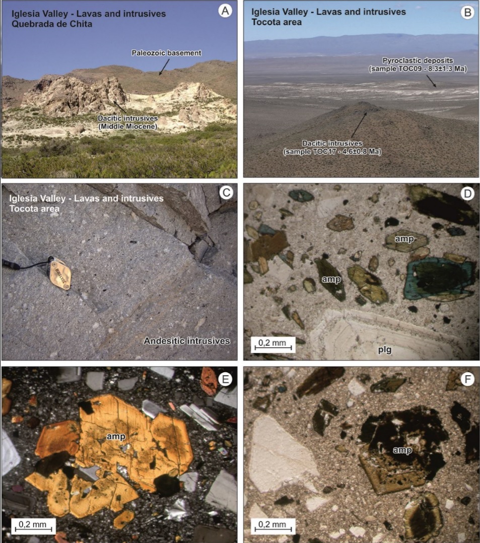 FIG. 4. Lava and intrusive rock within of the Lomas del Campanario Formation. A. Light colored dacitic intrusives outcropping in Quebrada de Chita, intruding Paleozoic basement; B. View to the southeast from Quebrada de Tocota; at the front, dacitic intrusive bodies, at the back, low relief pyroclastic deposits; C. Detail of plagioclase, hornblende-bearing andesite outcrops in Quebrada de Tocota; D. Andesite with porphyritic texture, with zoned and in sieve textured plagioclase (plg) and greenish amphibole (amp); E. Detail of a zoned amphibole phenocrysts in the dacitic intrusives, with quartz, alkali feldspar-rich groundmass; F. Porphyritic andesites with zoned amphibole and a partially clay-altered groundmass.