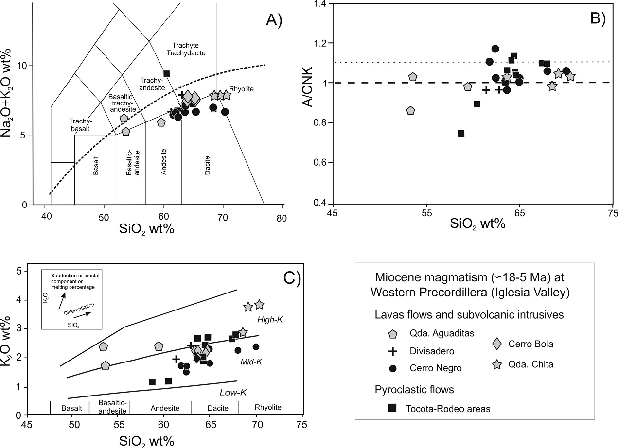 FIG. 5. Geochemical features of Miocene arc-related pyroclastic rocks and lavas from Iglesia Valley, Western Argentine Precordillera. A. Total alkali versus silica classification diagram (Le Maitre et al., 1989); B. Plots of molar Al (Na+K+Ca) ratios versus silica content, showing a metaluminous signature; C. K2O versus SiO2 diagram shows a medium to high-K signature for pyroclastic rocks, lavas and subvolcanic intrusives of the Iglesia Valley area, with a general trend for subduction or crustal components (Kay et al., 2013).