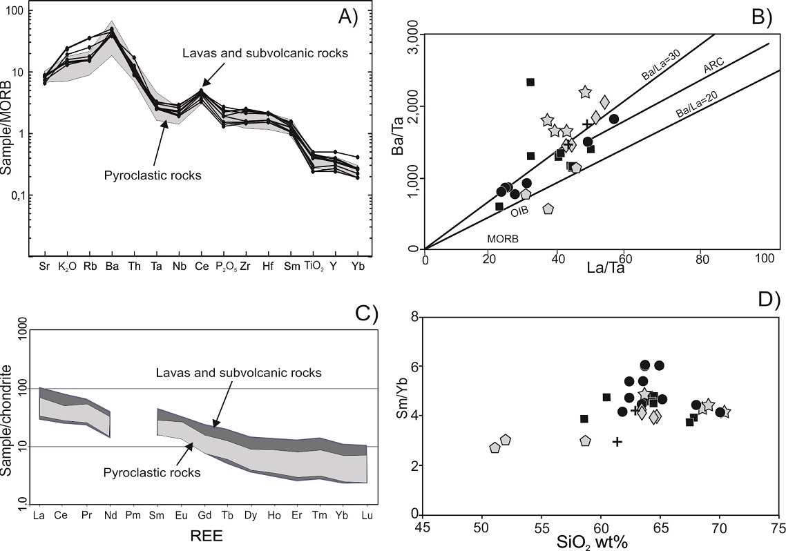 FIG 6. A. MORB normalized (Pearce, 1983) trace element pattern for pyroclastic rocks (grey pattern) from Rodeo and Tocota areas, and lavas and subvolcanic rocks (black dots) from Chita, Cerro Bola, Cerro Negro, Aguaditas and Divisadero; both groups show a similar volcanic arc-related behavior in their trace elements; B. Ba/Ta versus La/Ta showing the volcanic arc-related distribution of the samples; C. Chondrite normalized REE pattern (Nakamura, 1974) for pyroclastic rocks, lavas and subvolcanic intrusives; D. Sm/Yb versus SiO2 diagrams showing a relative similar Sm/Yb ratios for the intermediate to silicic rocks (62-67 SiO2 wt%), except for some dacites from Cerro Negro. Symbols are the same as figure 5.