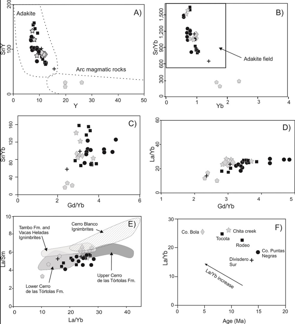 FIG. 7. A. Adakite signature for Miocene Iglesia Valley magmatic rocks according to Sr/Y versus Y plot (Castillo, 2012); B. Sr/Yb ratio versus Yb diagram showing adakitic field (e.g., Defant and Drummond, 1990; Martin et al., 2005); C. Cerro Negro lava flows and Tocota-Rodeo pyroclastics rocks show the higher Sr/Yb and Gd/Yb ratios, indicating a more pronounced adakitic geochemical affinity; D. La/Yb versus Gd/Yb diagram showing adakitic like ratios according to Mori et al. (2007); E. La/Yb versus La/Sm plot for Iglesia Valley Miocene magmatism and coetaneous volcanic rocks from the main arc over the Pampean flat slab (data from Litvak et al., 2007), and rocks from Miocene arc in Southern Puna (data from Montero et al., 2010); F. La/Yb versus age diagram for the Iglesia Valley magmatic rocks dated in this work, they display an increase of La/Yb ratio in younger samples (data from table 2 and Appendix; age for Chita sample corresponds to Jones et al., 2016). Symbols are the same as figure 5.
