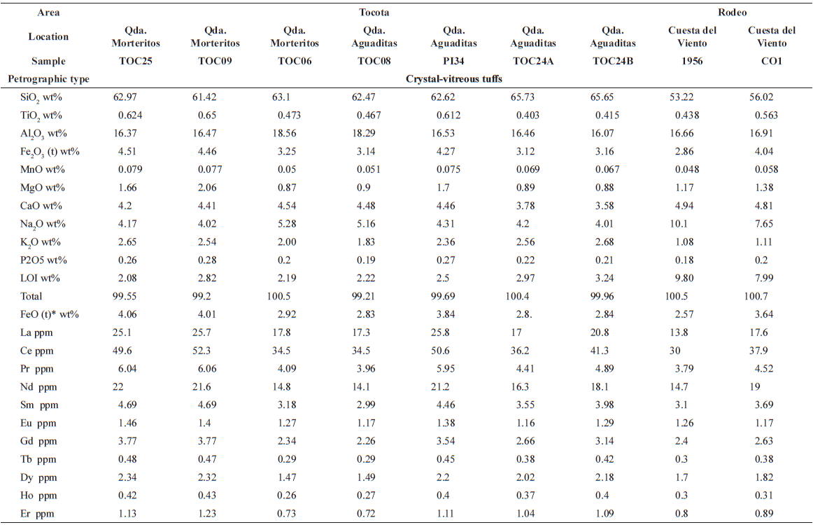Whole rock major and trace element analyses were carried out at Activation Laboratories, Canada (www.actlabs.com (last visit 23-08-2017)). Analyzed samples of lavas and subvolcanic rocks are from Cerro Divisadero, Cerro Bola, Quebrada de Chita, Cerro Puntas Negras and Cerro Negro. Samples of pyroclastic rocks were obtained at Tocota, Bella Vista, Tudcum, Rodeo, Cuesta del Viento and other outcrops along the Iglesia valley (Fig. 2). Results of determinations and location of samples are summarized in Appendix. The pyroclastics rocks sampled in different localities are not differentiated in the diagrams, while the lava flows and intrusive rocks are differentiated within the plots to show some variable chemical behavior between localities. Some tufts in Rodeo area have unusually high LOI values related to minerals formed by vitreous matrix devitrification, Appendix.