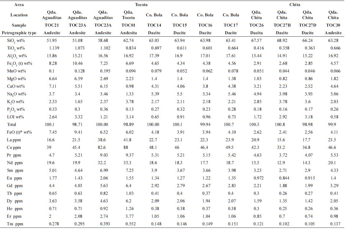 Sr/Yb ratios of Quebrada de Chita and Cerro Negro volcanic rocks are higher than the adakitic volcanic rocks of Cerro de las Tortolas in the main arc. The differences in the adakitic signal intensity (Fig. 8C) could be ascribed to the subduction and crustal variable components involved in its formation and related to their positions within the regional tectonic setting.