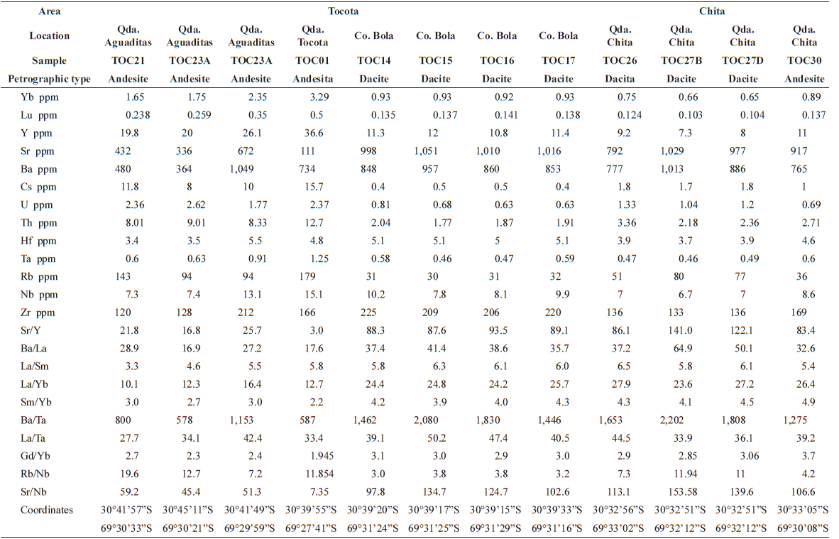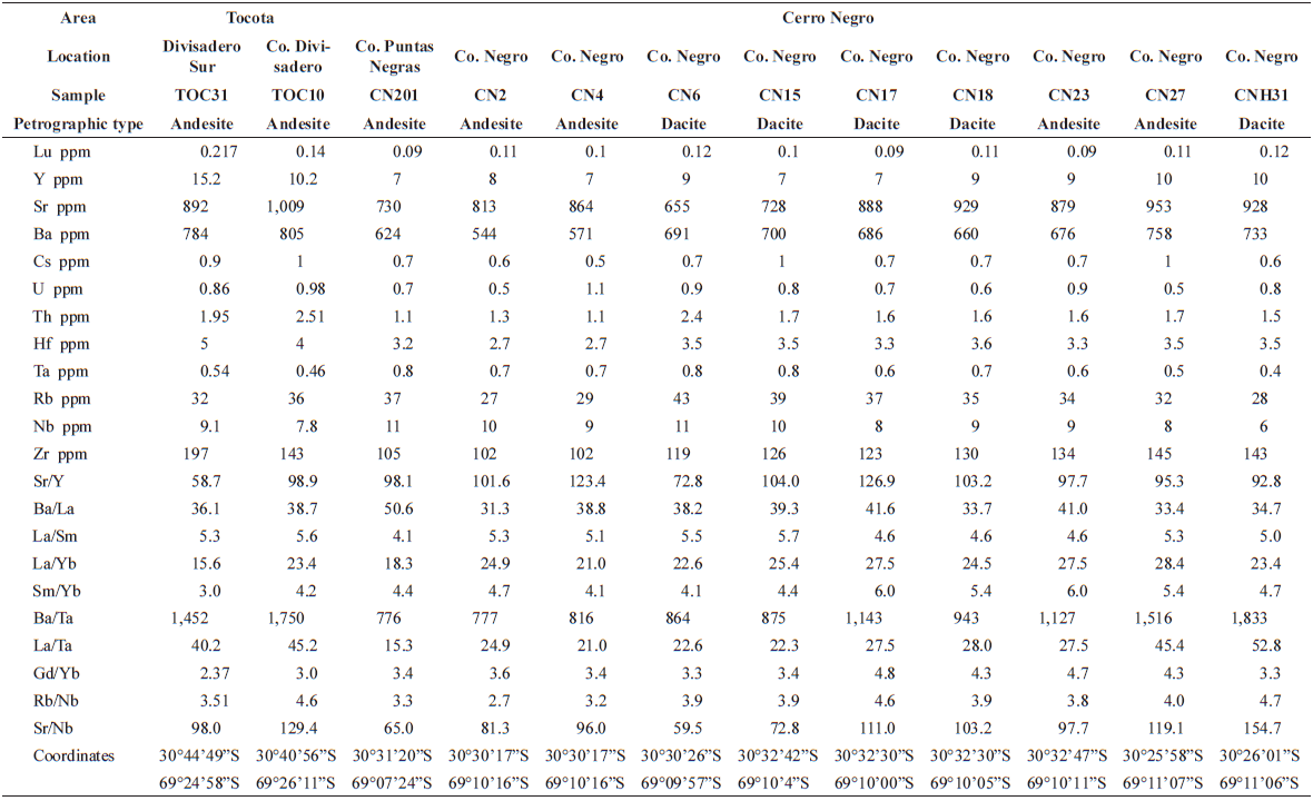Overall, considering ages and variations in the Sm/Yb and La/Yb, evolution of Iglesia Valley Basin magmas was firstly controlled by amphibole fractionation. As the time progress, the increase in these ratios (Appendix) would suggest a gradual increase in pressure conditions, with garnet as residual phase in magma equilibration site.
