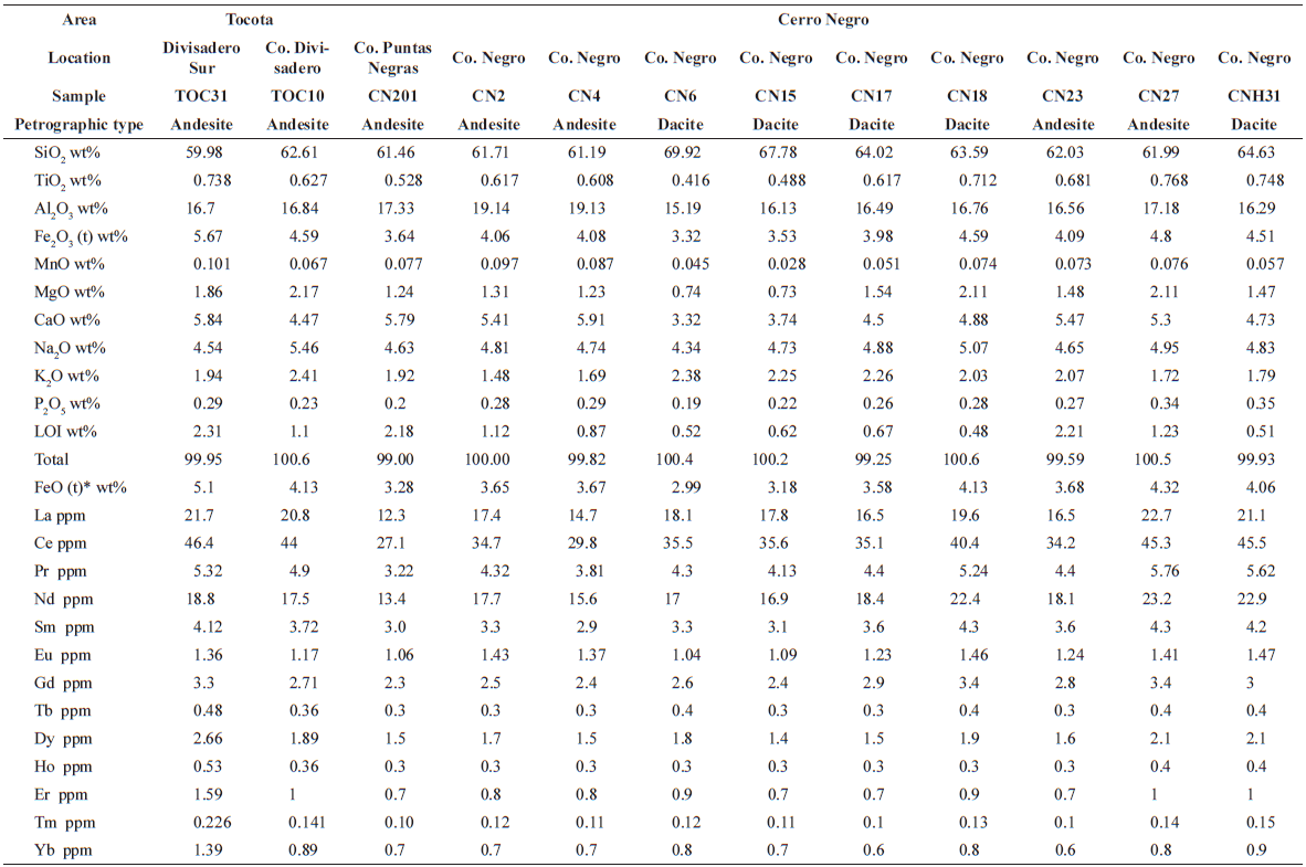 Plot of K2O versus SiO2 (Fig. 5C) shows that most of the analyzed rocks have medium to high K2O content, being pyroclastic rocks near or within the high-K field. The samples that plot in or near the medium-K field are generally from the early to mid-Late Miocene lavas from Cerro Negro, Cerro Bola and Divisadero; while lavas from Quebrada de Chita and Quebrada Aguaditas are within the high-K field.