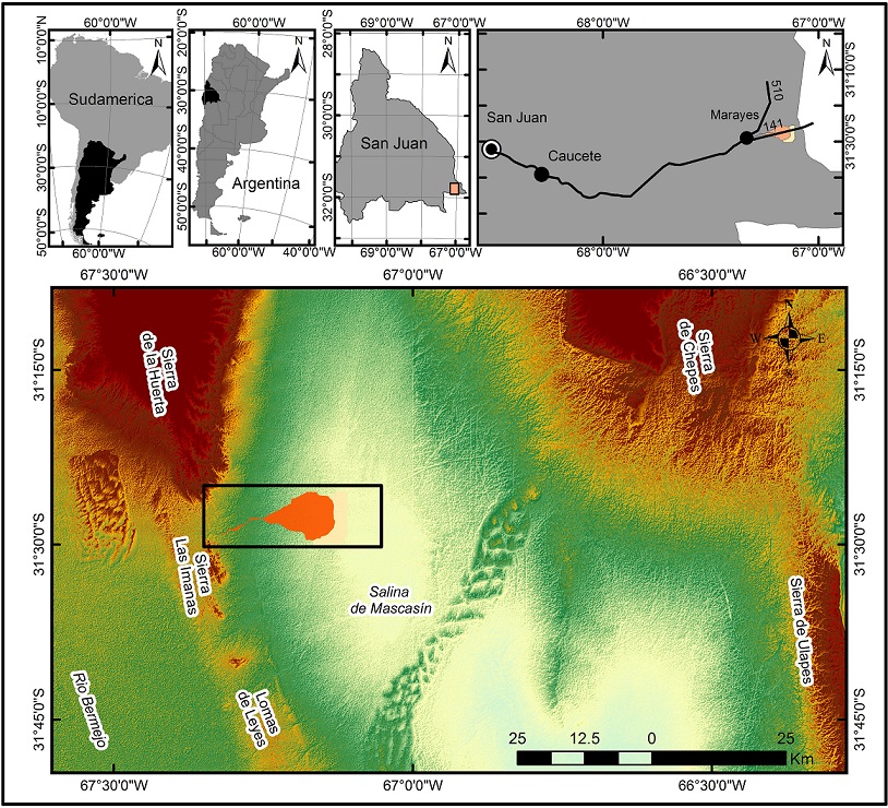 Al Este de la ciudad de San Juan y en el límite con la provincia de La Rioja, se desarrolla un valle intermontano denominado Depresión del Gran Bajo Oriental, emplazado en las Sierras Pampeanas Occidentales en el antepaís fracturado (Criado Roque et al., 1981; Jordan et al., 1983; Suvires, 1996). Este valle está circunscrito por las sierras de La Huerta, Las Imanas, y Lomas de Leyes al Oeste, y las sierras de Chepes, Ulapes y Las Minas por el Este (Fig. 1). Las sierras de La Huerta-Imanas están formadas por rocas de basamento cristalino representado por el Complejo Valle Fértil, y rocas sedimentarias triásicas del Grupo Marayes y cretácicas del Grupo El Gigante (Bossi, 1976; Vujovich et al., 2007). Su piedemonte oriental presenta conos aluviales cuaternarios, y en las inmediaciones de las salinas se presentan acumulaciones eólicas de los Médanos Negros y dunas longitudinales y transversales (Suvires, 1986; Vujovich et al., 2007; Tripaldi y Forman, 2007). Los Médanos Negros y las dunas transversales al borde de la salina han sido datadas por Luminiscencia Ópticamente Estimulada (OSL) en 2.540±240 años y entre 900±70 y 400±65 años respectivamente (Tripaldi y Forman, 2007). Los depósitos sedimentarios del arroyo Papagayos en parte cubren y se interdigitan con estos depósitos eólicos.