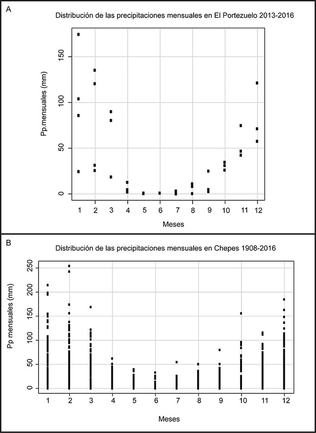 Son pocas las estaciones meteorológicas cercanas a la zona de estudio con datos disponibles. Entre ellas, se utilizaron la estación de El Portezuelo, ubicada en la sierra de Chepes que bordea el sector NE de la salina de Mascasín y presenta un tipo climático similar al de la sierra y la estación de Chepes, ubicada en el valle al este del área de estudio. Los datos de estas estaciones meteorológicas reportan que en los meses de diciembre, enero, febrero y marzo se concentra la mayor cantidad de precipitaciones, mientras que en el invierno estas son escasas a nulas (INTA, 2016). Para el caso de la estación de Chepes se obtuvieron datos del Servicio Meteorológico Nacional desde 1908 hasta la actualidad, aunque con muchos intervalos sin medición. Sin embargo, se observa que la distribución de las precipitaciones es similar, con mayor concentración estival (Fig. 2).