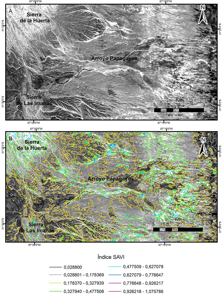 Finalmente, con el fin de poder discriminar diferentes zonas en la llanura de inundación (sectores drenados y mal drenados, charcos con acumulación de sales) del SFD del arroyo Papagayos, se utilizó la transformación del índice SAVI. Este índice combina bandas del infrarrojo cercano y el espectro visible para estimar la calidad y vigor de la vegetación, y se aplica en regiones áridas porque tiene en cuenta la influencia del suelo por su color y brillo (asignando un valor de L de 0,5; Huete, 1988; Sánchez Rodríguez et al., 2000). Este índice de vegetación arroja valores que oscilan entre -1 y 1, siendo aquellos valores menores de cero los que indicarían ausencia de vegetación (Carvacho Bart y Sánchez Martínez, 2010). Los datos obtenidos de la aplicación del índice SAVI muestran que un 7% presenta muy escasa a nula presencia de vegetación; el 41% de la superficie presenta valores entre 0,178370 y 0,327939, los que se distribuyen en el piedemonte y en la llanura de inundación del sector medio. Por otro lado, el 41% presenta valores entre 0,327940 y 0,477508 y se ubican en las zonas elevadas topográficamente (sierras), en el sector distal del lóbulo terminal y en el borde costero de la salina, donde aflora la napa freática. Un 9% presenta valores de 0,477509 y 0,627078 que corresponden a la cubierta vegetal que se dispone en los cauces temporarios principales. Finalmente, el 2% restante, presenta valores mayores a 0,627079, los que se ubican como asomos aislados en los cauces principales y en los cauces de la plataforma arenosa de la salina donde se junta el agua de escurrimiento superficial con la napa.