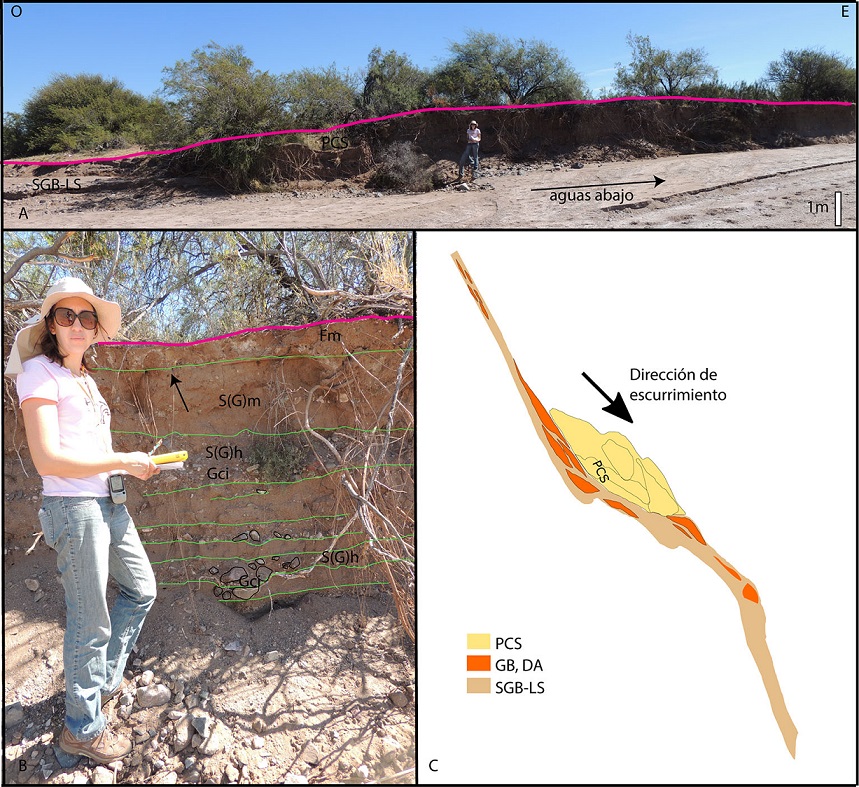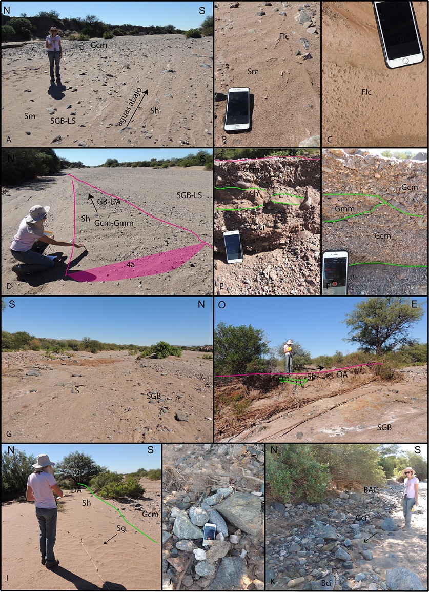 Interpretación: su construcción se inicia a partir de un núcleo gravoso de manto de gravas de estructura difusa, y luego crece verticalmente con arreglo granodecreciente, con la generación de cosets de Sh y Sl a medida que decrece la energía del flujo (Hein y Walker, 1977; Ashmore, 1991; Miall, 1996). Entre las estaciones lluviosas el viento modifica los sedimentos arenosos depositados, generando pequeñas óndulas de arena en arenas finas (sand ripples; Sharp, 1963), similar a los parches de arena mencionados por Tripaldi y Limarino (2008) que se generan por clastos que se transportan por saltación con acumulación de clastos más gruesos y pesados en las crestas (Bagnold, 1954; Anderson, 1987; Kocurek, 1991).