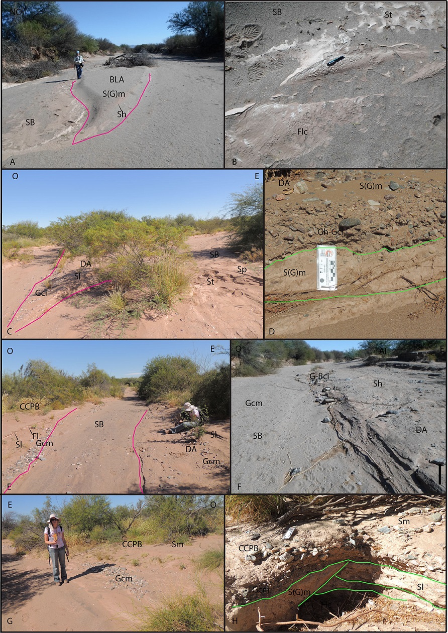Son depósitos dominantemente arenosos y con algunas gravas aisladas o en forma de pequeños lentes, de morfología tabular de poca altura 0,30-0,50 cm que se ubican en el lecho de los canales activos (Fig. 11f y g). El techo de los depósitos es plano, e internamente se observan algunas superficies limitantes de segundo orden y superficies de cuarto orden mostrando la superposición de eventos torrenciales. El arreglo facial que presentan está dado por las litofacies Gh-S(G)l-S(G)h (Fig. 11g); Sh-Sr-Fl .